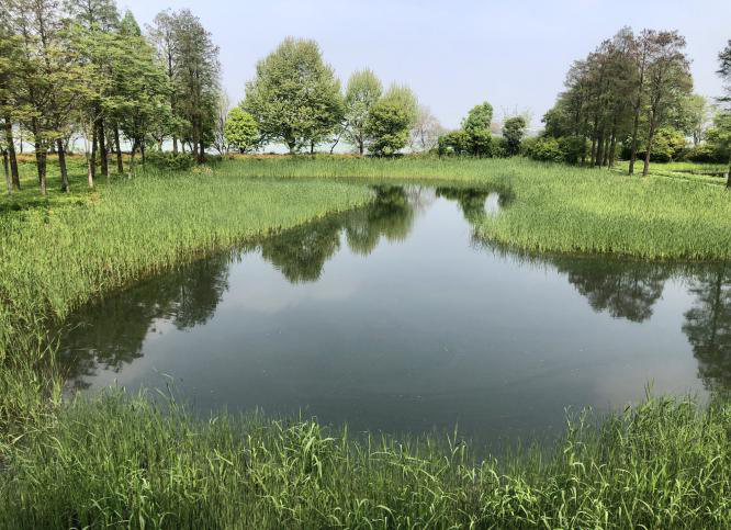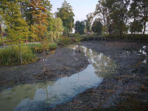 濕地公園原為東湖當地居民進行水產養殖的“田”狀魚塘,2016年建成后開放。原濕地公園水循環系統故障,導致水體富營養化、鳥類減少、空氣質量下降,存在整體景觀效果差、水生態系統不穩定、管養維護不到位等諸多問題,主要體現在公園上游挺水植物瘋長、中部輪葉黑藻遮擋水面、局部底泥淤積。天氣炎熱時,觀賞水面景觀中布滿青苔、輪葉黑藻,秋冬季則落葉枯枝堆積難清理,嚴重影響公園內的景觀效果及水質效果。